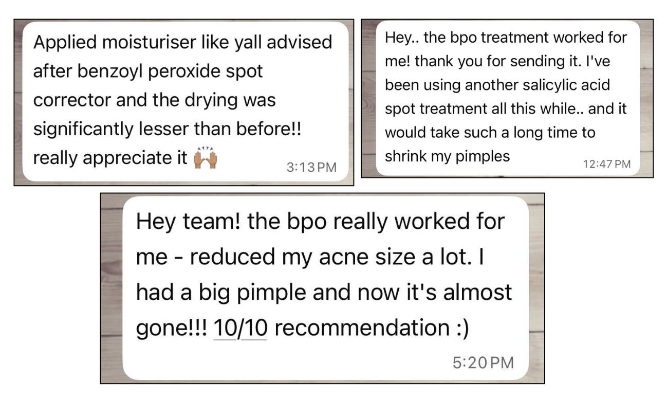 When used correctly and in the right concentration, it serves as a safe + effective anti-acne treatment. Even in our trial cohort, users saw positive changes w.r.t to their acne with benzoyl peroxide.
