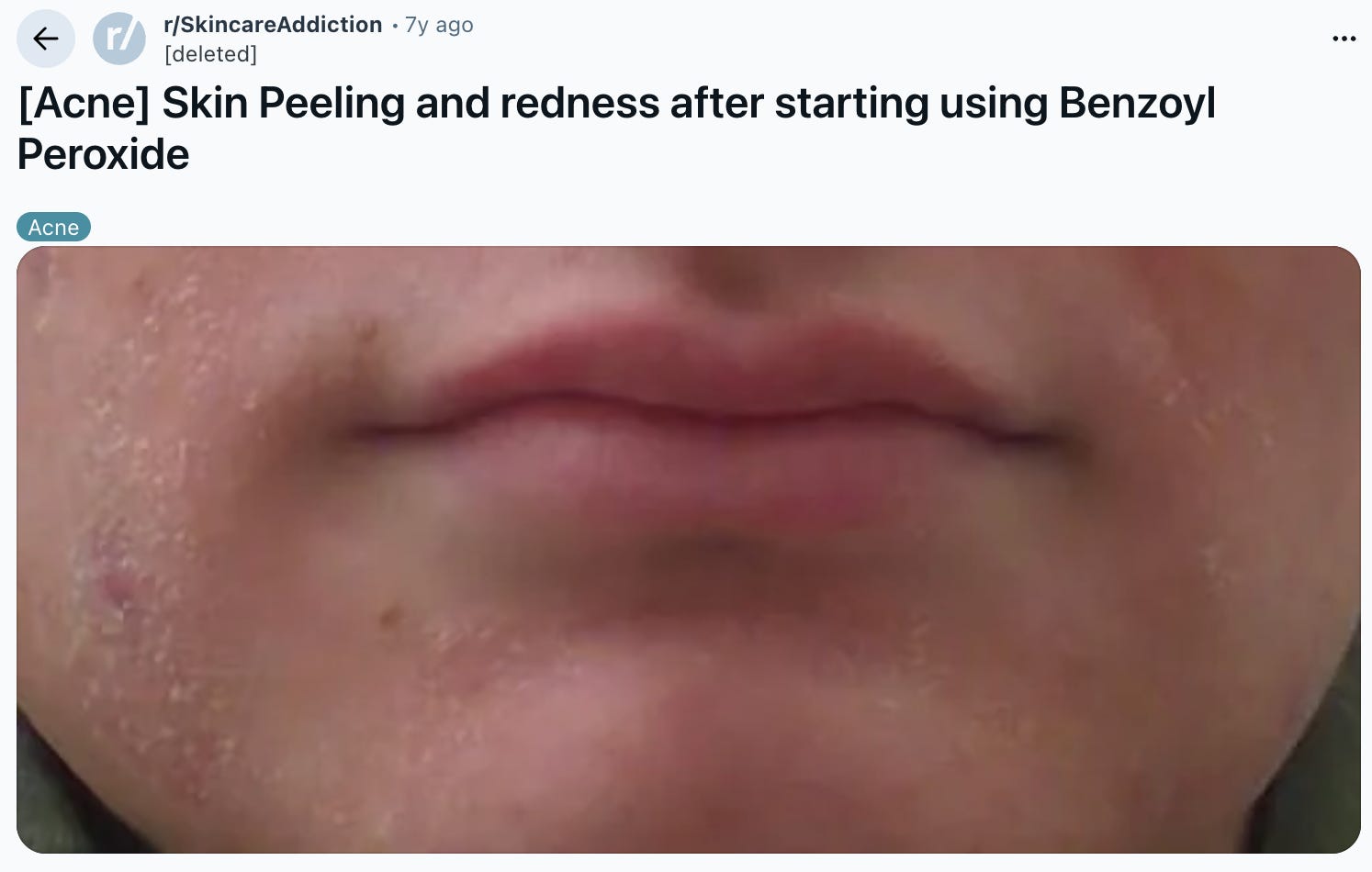 This is why patch testing becomes critical before using benzoyl peroxide. If you experience severe itching or burning, or redness or dryness that does not improve in a few days, you should discontinue use immediately and consult your dermatologist.