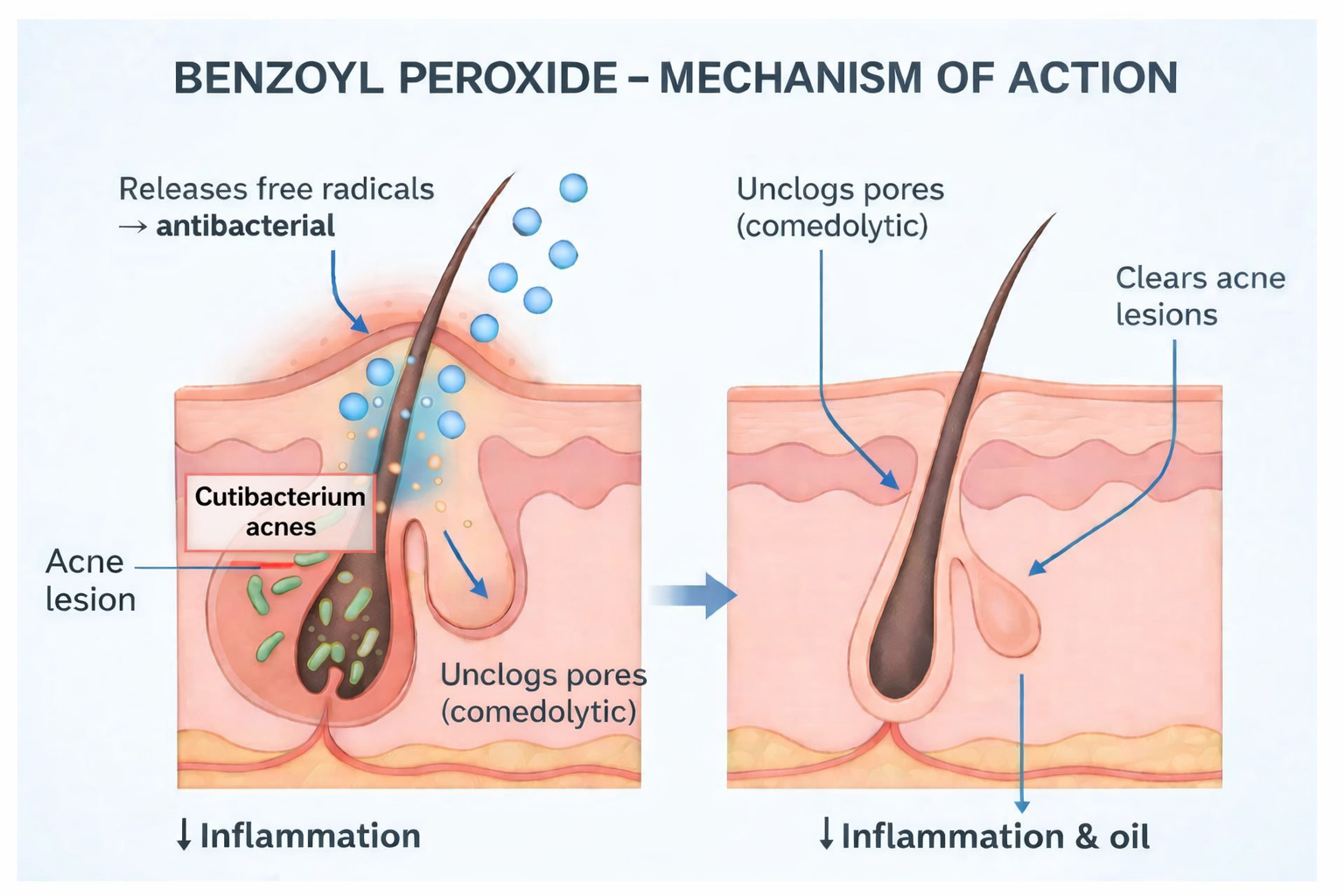 Benzoyl Peroxide doesn’t contribute to antibiotic resistance: Unlike topical antibacterial gels like clindamycin (an antibiotic), benzoyl peroxide doesn’t pose a risk of antibiotic resistance since it’s not an antibiotic. This makes it a more favourable first-line treatment option.