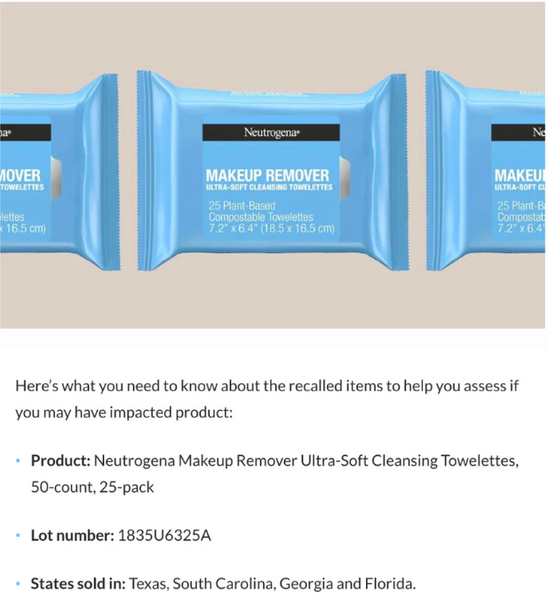 Don’t panic! You can still use other batches of the ‘Neutrogena Makeup Remover Ultra-Soft Cleansing Towelettes’ if you’d like to, just not the specific lot number that was recalled (refer below).