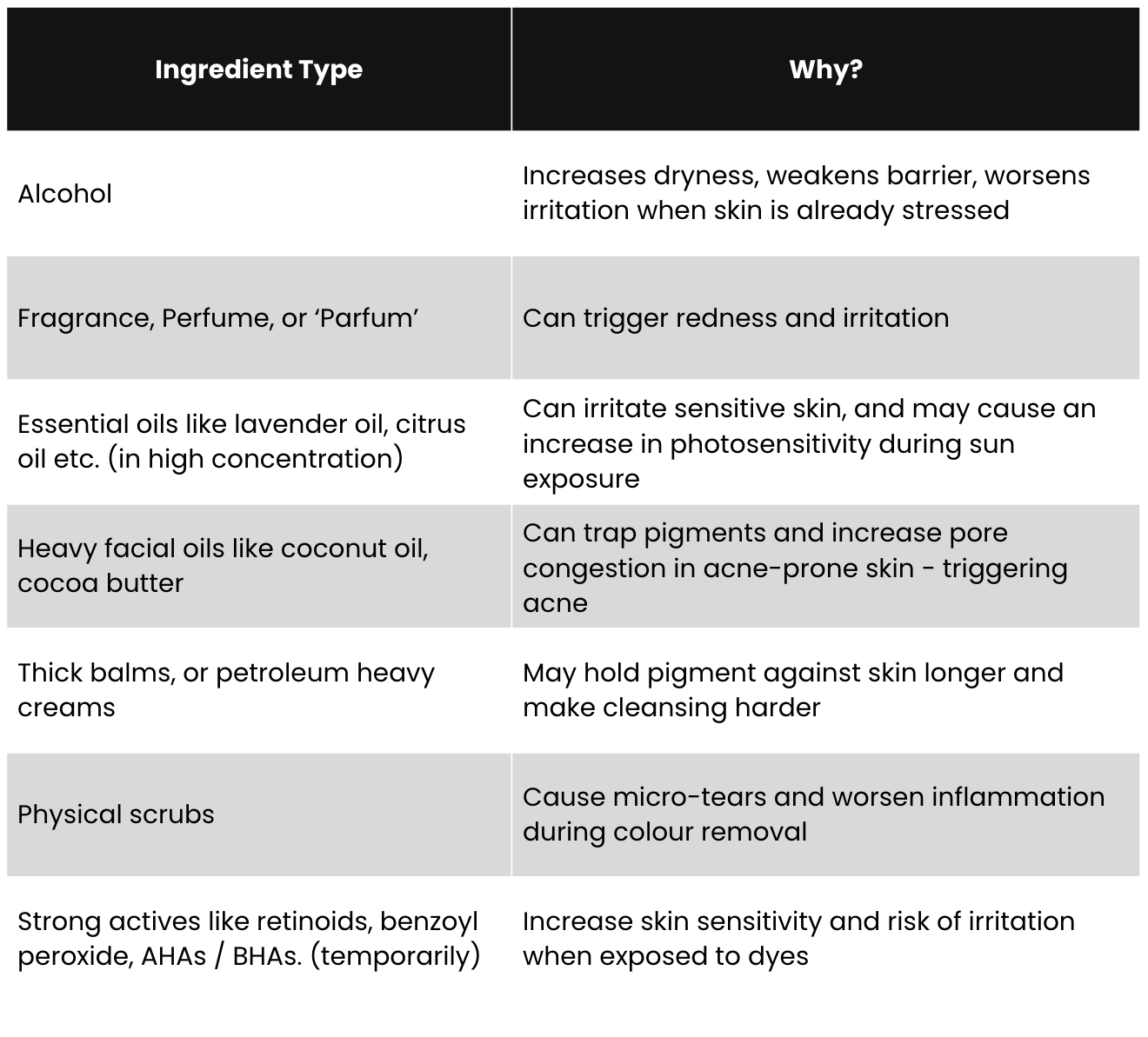 Our natural instinct is to aggressively scrub off stubborn colours as if our life depended on it. And I get it - nobody wants to go to work the next day looking like they joined the cast of Avatar. But this scrubbing inflicts even more damage to the skin barrier. When you scrub hard with a cleanser, loofah, or physical exfoliants like almond scrub, or even double cleanse repeatedly, you cause micro-tears in the skin because of the friction. This puts your skin barrier at a risk of inflammation.