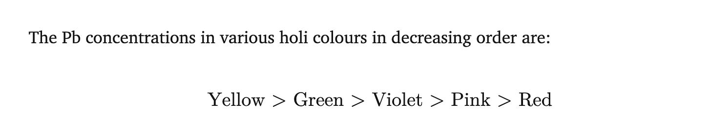 Yellow and green powders have shown higher lead levels in certain studies, followed by violet, pink and red.