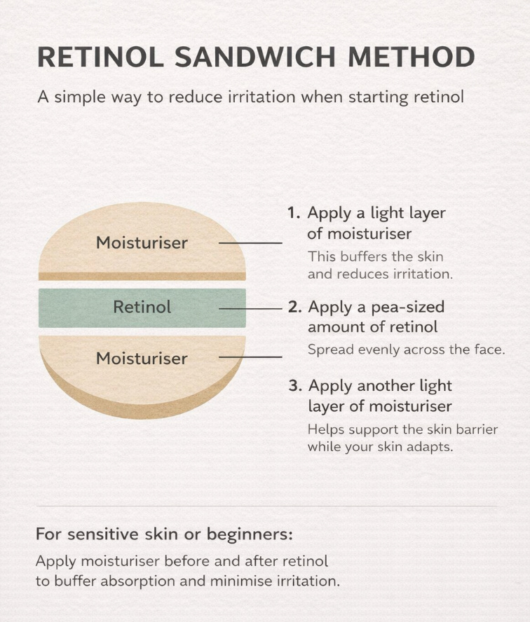 For sensitive skin, try the sandwich method while using retinol: Apply moisturiser first, wait for it to absorb, apply retinol, then moisturiser again. This buffers absorption without blocking efficacy and helps prevent irritation.