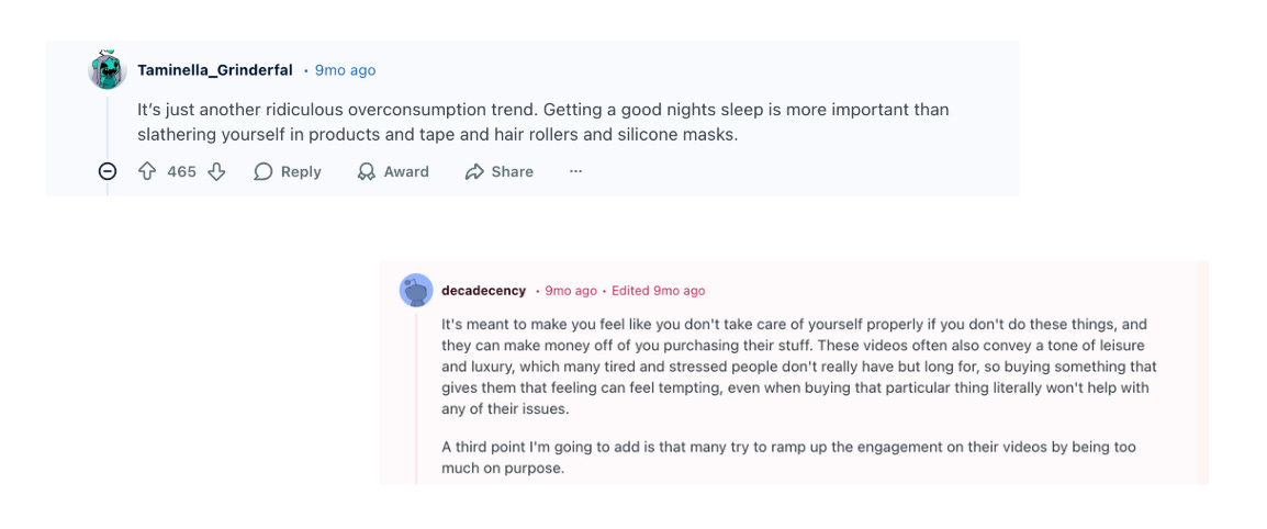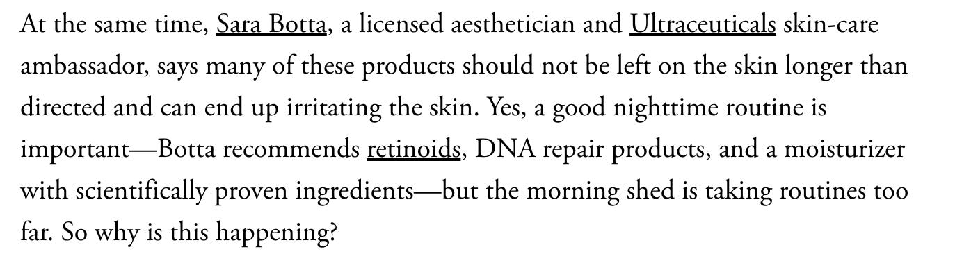 Morning shed blew up less because of skin science, and more because it fits neatly into our culture of performance productivity; where proving your commitment often means performing elaborate rituals. In this case, that performance shows up as stacking multiple skin products even when they offer little to no benefit and are backed by scientific evidence (in fact, can harm your skin).