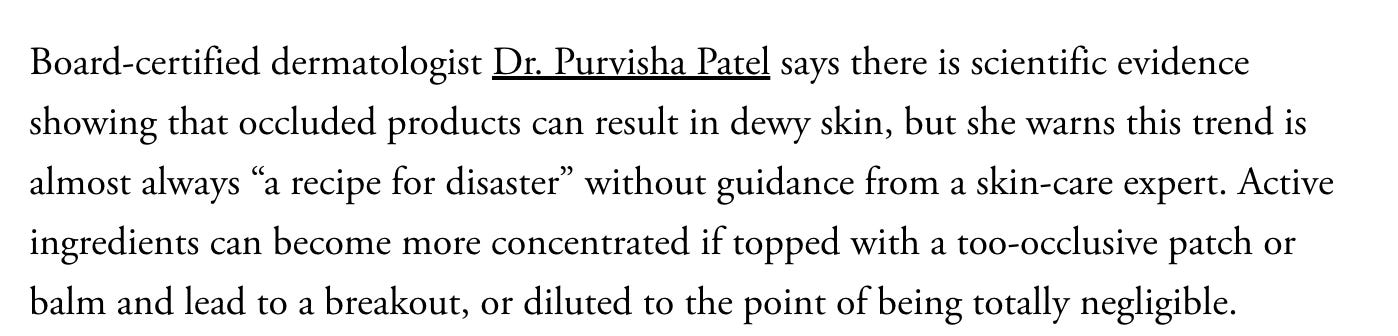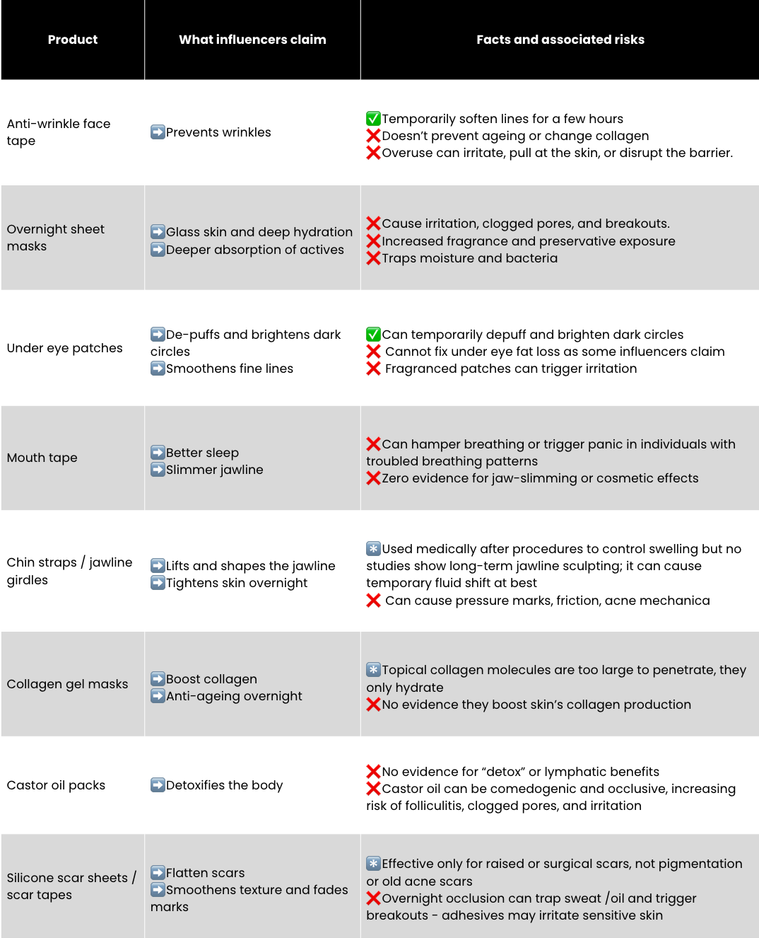 Now, before you jump at me for outright dismissing morning shed entirely (which I am btw), some of the individual products creators use do have merit. A ceramide-rich moisturiser, a hydrating sheet mask, and a retinoid-based serum (when used correctly and containing the right composition) can benefit the skin. But mummifying yourself with tapes, patches, masks, occlusives, chin straps, and castor oil packs overwhelms, irritates and suffocates your skin (and is downright crazy IMO).