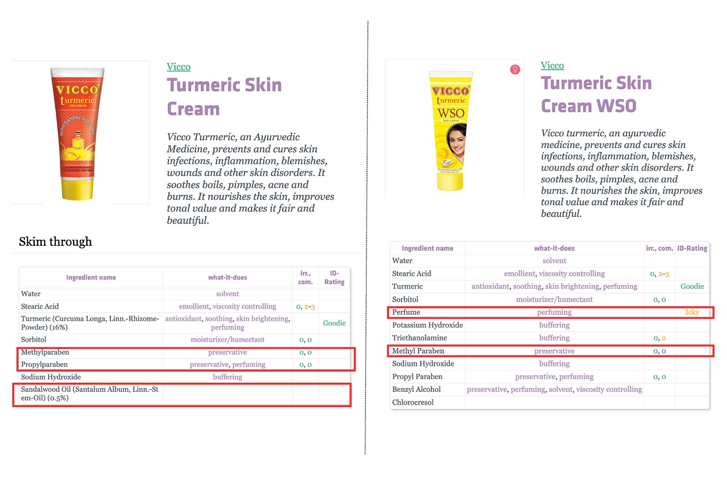 The original Vicco Turmeric (first marketed in 1971) contained sandalwood oil, which gave it its peculiar sandalwood fragrance. It was thick, greasy, and fragrant. This formulation is still available in the market. But this greasy consistency was not suitable for everyone, especially people with oily skin, so they made another formulation and called it ‘Vicco Turmeric WSO’ (‘without sandalwood oil’). This was designed to be the answer for people with oily or acne-prone skin. But unfortunately, even the revised formulation contained ingredients that could irritate sensitive skin.