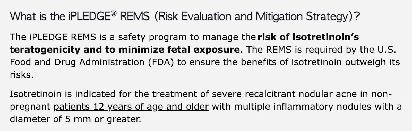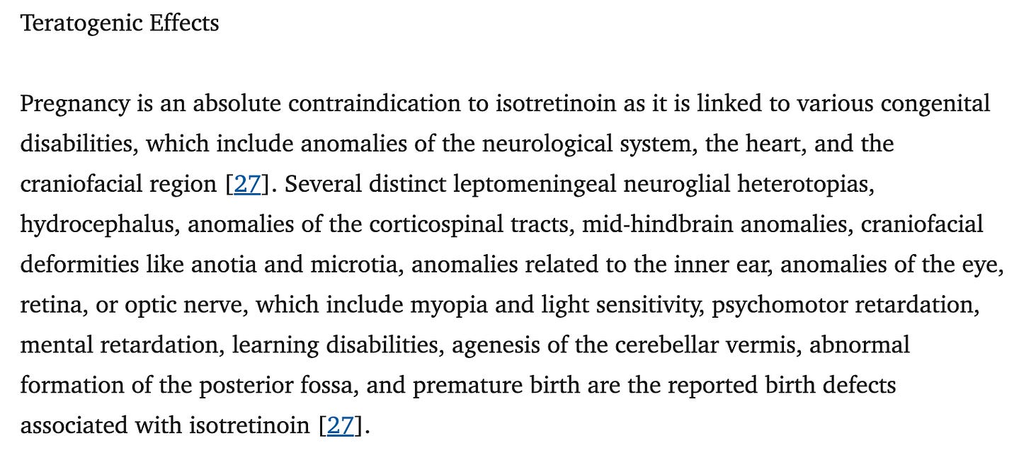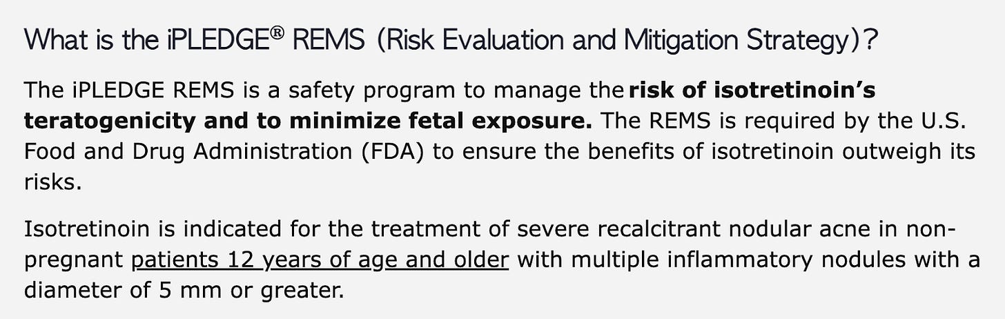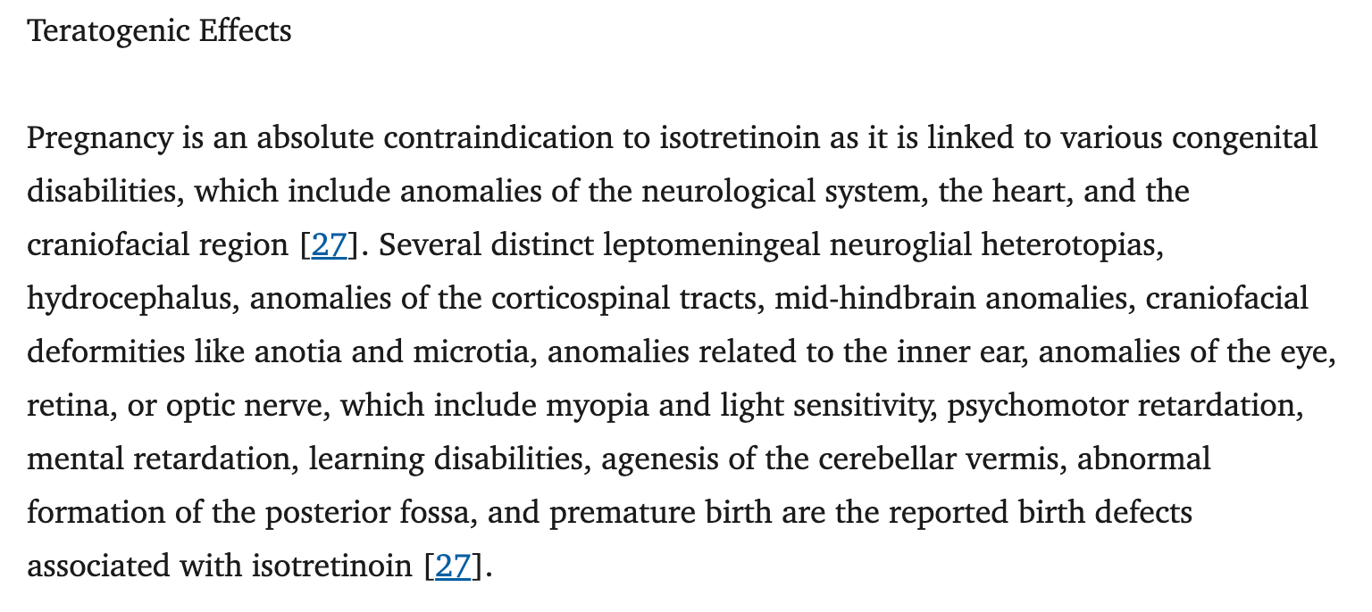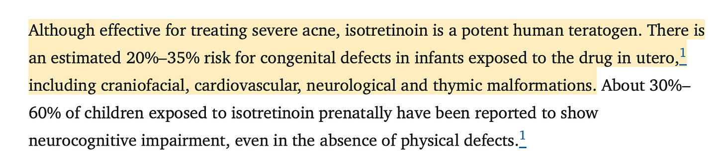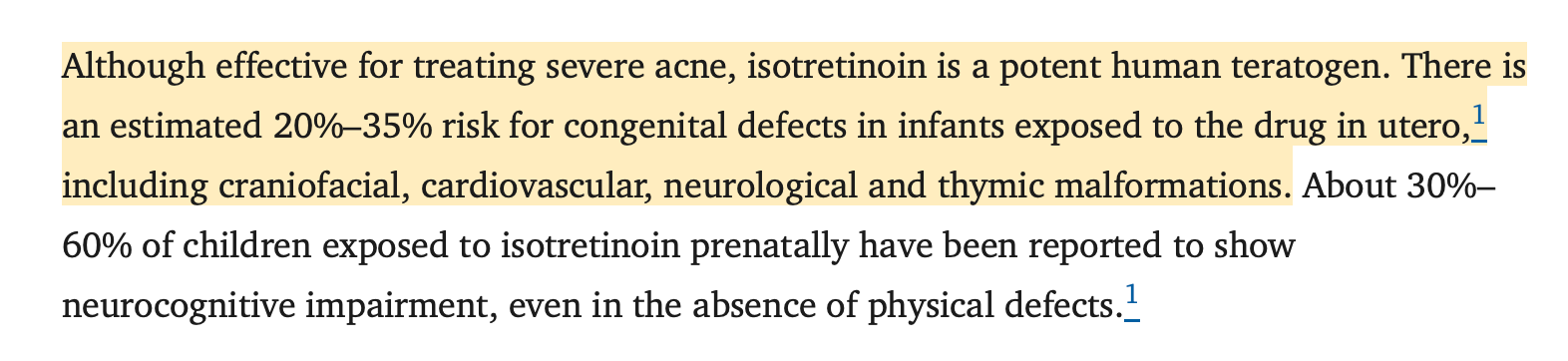 In fact the risk is so great that in some countries “pregnancy prevention programs” are mandatory during isotretinoin treatment - to manage the risk of isotret’s teratogenicity and to minimise fatal exposure.