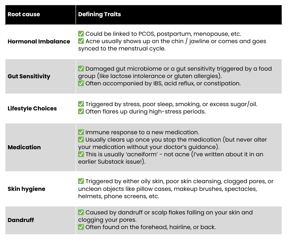To understand my own acne, I did years of research on the subject - reading clinical papers, talking to dermats, understanding why acne even happens. In all my research, I broadly found 6 potential causes of acne.