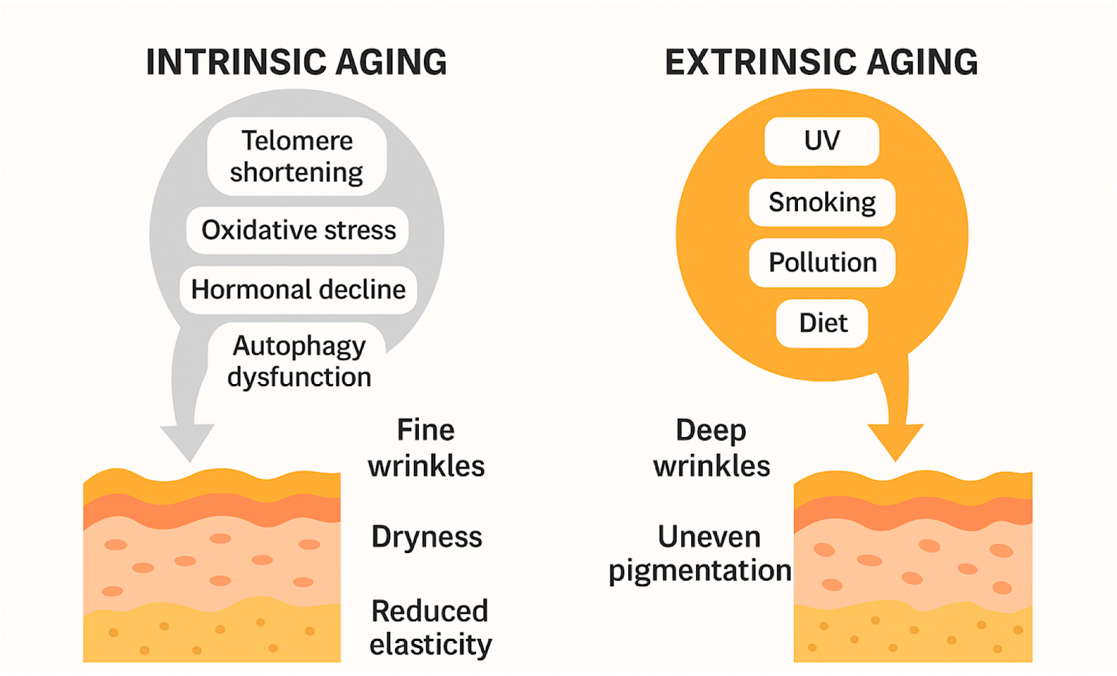 Intrinsic ageing: Caused by internal factors like hormonal health, poor sleep, internal inflammation, natural cellular damage, and mitochondrial slowdown.